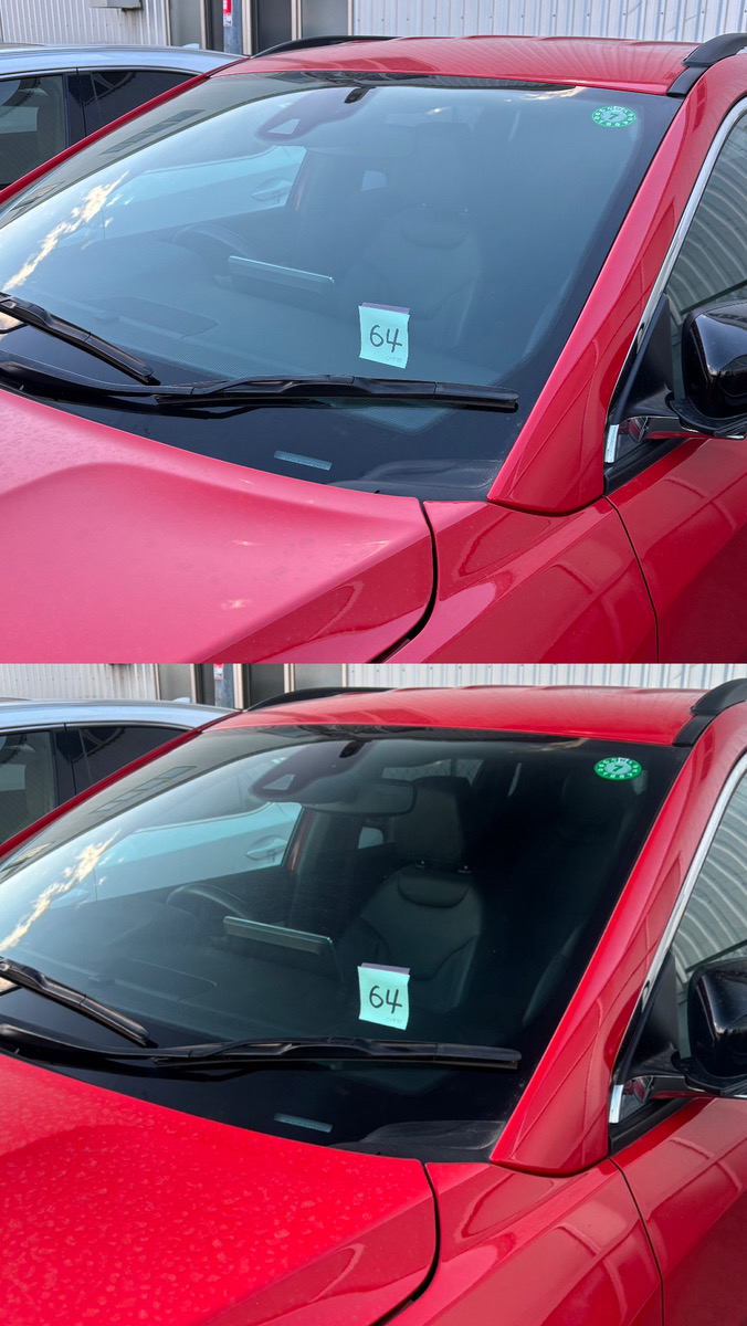 試しに車のフロントガラスをレンズなしとレンズ越しで写真撮り比べてみました。